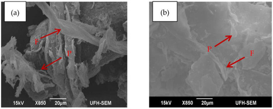 From Figure 6, it is evident that the microscopic structures of the two samples are different. In terms of surface morphology, torrefied SCB appears darker in colour with rough surface compared to untorrefied SCB with lighter and smooth surface. However, no morphological changes are noticeable on the surface of the structure of untorrefied SCB (Figure 6b) due to lack of pre-treatment prior to analysis, whereas the reverse is the case for torrefied SCB (Figure 6a) as morphological changes are quite evident on the surface of its structure. This obviously can be attributed to thermal treatment. Nonetheless, two major morphological features are clearly shown in the images of both samples and are indicated by the arrows. These are fibre structure and pith, which are clearly denoted by the letters “F” and “P” in Figure 6a,b, respectively. The noticeable pith in Figure 6b is somewhat ruptured after thermal treatment, as indicated by the arrow in Figure 6a. Parallel stripes that are partially covered with residual material form the main part of the surface of the fibre in Figure 6a. The image of torrefied SCB also shows a highly disordered carbon structure that may promote high reactivity during gasification [100]. The fibrous structure (F) in Figure 6b is clearly exhibited in Figure 6a; this was due mainly to hemicellulose and lignin consumption during torrefaction. The variation in the macro- and microstructure explains why the grindability of torrefied biomass is superior to that of untorrefied biomass [15]. A more permeable structure with larger surface area could also be observed from the image of torrefied SCB compared to untorrefied SCB. These are favourable properties that lead to high conversion efficiency during gasification, and confirm that torrefied SCB is a carbon-based feedstock that is more suitable for gasification in a downdraft system appropriately developed to harbour the feedstock characteristics.