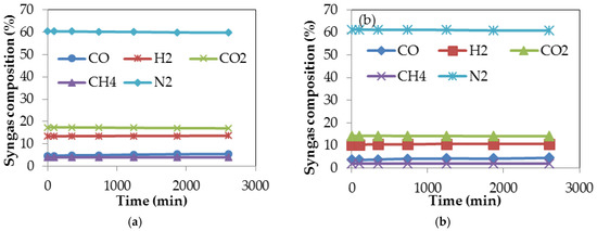 Syngas composition obtained after computer simulation of the gasification processes of (a) torrefied SCB; and (b) untorrefied SCB.