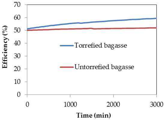 The conversion efficiency of the gasification process of both samples showed that higher efficiency was achieved with torrefied SCB as compared to the efficiency reached by using untorrefied SCB as feedstock. This is evident from Figure 8 and agrees with the fact that the gasification process efficiency of torrefied biomass is always greater than that of untorrefied biomass, as reported by Dorde [32]. This difference in efficiency is significant because the efficiency of torrefied SCB increased with time from about 50% to a maximum percentage of ca. 60%, whereas that of untorrefied SCB began at around 50% efficiency and remained constant even as the gasification time increased. This percentage increase in efficiency between both samples is approximately 14%, which is statistically significant and can be attributed mainly to changes in the properties of SCB after undergoing torrefaction, especially the alteration in chemical composition that resulted in reduced O–C ratio as well as the increased content of C and calorific value as clearly noted in Table 2. With reduced O–C ratio, the gasification characteristics of torrefied biomass materials are improved compared to the untorrefied materials, and efficiency of conversion of a gasification process depends upon the characteristics of the feedstock; low conversion efficiency and poor gas quality including high tar concentration are a consequence of the gasification of low quality biomass [40,62]. The difference in efficiency between the gasification processes of torrefied and untorrefied SCB could also be attributed to the ash catalytic effect owing to the difference in content of catalytic elements in torrefied SCB, although inorganic elemental component analysis may be necessary to establish this fact. High inorganic matter content due to increased content of ash in torrefied biomass may improve gasification efficiency as the rate of gasification also depends on catalytically active constituents of the biomass [62,102].