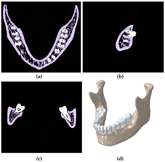 A computer-aided model of a normal mandible (i.e., cadaveric bone for a healthy adult female, approximately 25–30 years of age) was created from CT scan data using the Mimics software 17.0 (Materialise, Plymouth, MI, USA). The healthy model included mandible cortices, cancellous, and teeth. Each component was segmented (i.e., extracted) and smoothed appropriately to remove CT slice-edges. Gap between the teeth and mandible of approximately 0.2 mm was assigned to a layer represent the periodontal ligament. These 3D reconstructed components were extracted as separated STL files from Mimics [28]. This model was later used as a reference model for comparing the stress-strain data (Figure 1).