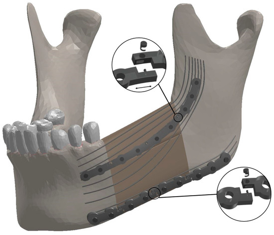 To simulate the most common reconstructive surgery, a 40 mm mandibular segmental detect was resected on the left half of the mandible bearing M1-3. A fibular double barrel graft was virtually made out of two segments of one fibula autograft consisted from separate cancellous and cortical bone. The double barrel graft had a total length of 40mm, a width of 14 mm, and a height of 38 mm to fill the resected area. To affix the graft into the remaining mandible, two releasable fixation devices with the dimensions of 77 mm × 6.4 mm × 2 mm were designed in Solidworks (Dassault Systèmes, Waltham, MA, USA) by following the outside contours of the bone. It is notable that the general dimension of these fixation devices match those referenced in the literature [29]; each of these simulated fixation devices consists of 4 mini-plates which were connected together with releasable cam screws (Figure 2).
