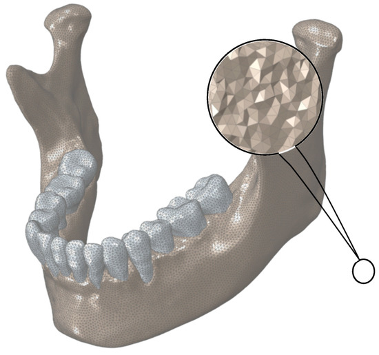 The 3D models of all components were meshed in Hypermesh (Hyperworks, Troy, MI, USA) with 10-node deformable, tetrahedral elements (C3D10) for more accurate results [30]. Figure 3 demonstrates the meshed healthy mandible.
