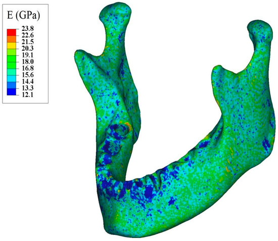 In addition, a constant isotropic Poisson’s ratio of 0.33 was assumed for the bone [31]. Finally, the corresponding densities and moduli of elasticity were assigned to each element. Figure 5 demonstrates the distribution of modulus of elasticity along the mandible.