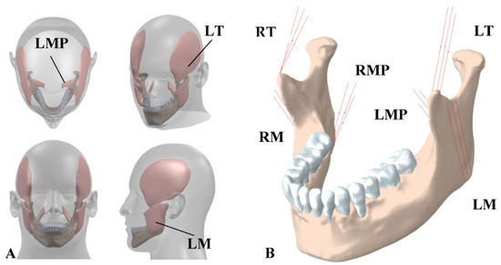(A) 3D structures of major masticatory muscles; (B) Each muscle is simulated by three truss elements, considering the origin and insertion points taken from the 3D structures of muscles. RT = Right temporalis, LT = Left temporalis, RMP = Right medial pterygoid, LMP = Left medial pterygoid, RM = Right masseter, and LM = Left masseter.