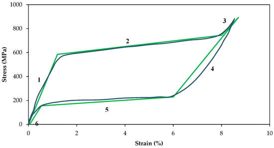 The required inputs for calibration of the UMAT are Ms (martensitic start transformation temperature), Mf (martensitic finish transformation temperature), As (austenitic start transformation temperature), and Af (austenitic finish transformation temperature), CM (the slopes of martensite in the stress-temperature phase diagram), CA (the slopes of austenite in the stress-temperature phase diagram), EM (Young’s moduli in the martensite in the stress-strain curve), and EA (Young’s moduli in the austenite in the stress-strain curve). To obtain EA and EM, tensile tests were performed on a wire with 1mm diameter and 60 mm length at the strain rate of 0.006 s−1 at room temperature using a BOSE ElectroForce 3330 (New Castle, DE, USA) machine. Figure 8 depicts the stress strain plot obtained from the loading-unloading of a superelastic NiTi wire.