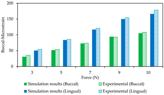 As seen in Figure 9, the experimental and the finite element data are in an agreement with each other (Lingual side: r > 0.99, p < 0.0005, RMSE (root mean square error) < 6.42 × 10−6; Buccal side: r > 0.99, p < 0.0005, RMSE < 2.8 × 10−6).