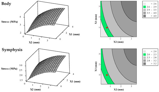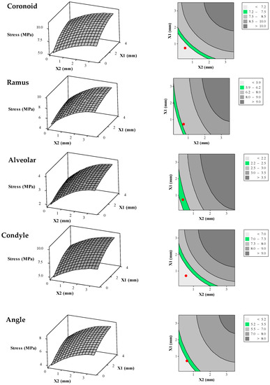Surface plots (left) and their corresponding contour plots (right) representing average von Mises stress in the different zones of the reconstructed mandible (i.e., alveolar, symphysis, body, angle, ramus, coronoid, and condyle) as a function of the diameters of superior and inferior wires of the Bone Bandaid apparatus. In the 2D contour plots (right), the desired ranges for the average von Mises stresses are presented as green areas. The red circles are representative for the average von Mises stresses resulting from the combination of optimized X1 = 1 mm and X2 = 0.65 mm.
