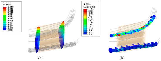 The success of healing period is measured by the safety of the fixation hardware (essential to avoid failure) while minimizing the gap between the host mandible and the grafted bone (necessary to ensure bone healing) [48,49]. At the interface between the grafted bone and host mandible the gap should be less than 300 micron [19,20] at all times, including the peak chewing load. The COPEN (i.e., contact opening) variable can be used in Abaqus to measure the relative position between the graft and host bone surfaces [50,51,52]. As seen in Figure 11a, the maximum gaps are 20.34 and 21.54 micron in the anterior and posterior regions of the graft bone, respectively. With these distances, it is expected that the healing progresses uninterrupted.
