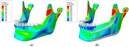 Von Mises stress distribution for: (a) a normal mandible; and (b) a reconstructed mandible with releasable Ti-6Al-4V hardware and underlying optimized NiTi Bone Bandaid wires. (Unit: megapascal (MPa)).
