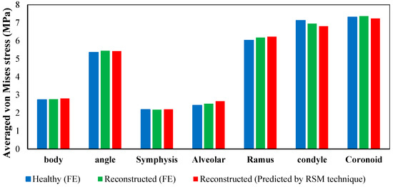 Figure 14 quantitatively compares the average von Mises stress in different zones of the normal mandible versus reconstructed one. The results show good agreement with each other (the maximum discrepancy of 4.6% on the condyle zone).