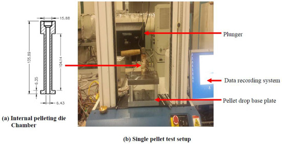 The microwave-assisted alkali pre-treated and untreated samples were compressed and pelleted in a single pelleting unit consisting of a plunger-cylindrical die connected to a computer that interprets and records the force-displacement data (Figure 3). The plunger was connected to the Instron universal machine (NVLAP Lab Code 200301-0, Norwood, MA, USA), in which the upper moving crosshead provided the load necessary to compress the biomass samples. About 0.5–0.8 g of selected pre-treated and untreated biomass samples was loaded into the die cylinder. The temperature adjusted at about 95 °C and a pre-set load compressed the samples. A 5000 N load cell fitted Instron universal machine was used and a pre-set load of 4000 N compressed the samples. The plunger compressed the biomass sample using a crosshead speed of 50 mm/min. Once the pre-set load was achieved, the plunger was stopped and held in position for 60 s to avoid spring back effect of biomass [23,35]. Ten pellets each were produced from pre-treated and untreated biomass samples, and the force-deformation data at compression and the force-time data at stress relaxation were recorded in the computer. The physical characteristics of the densified pellets such as pellet density, dimensional stability, and tensile strength were determined to evaluate the effect of the treatment combination of the various factors.