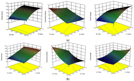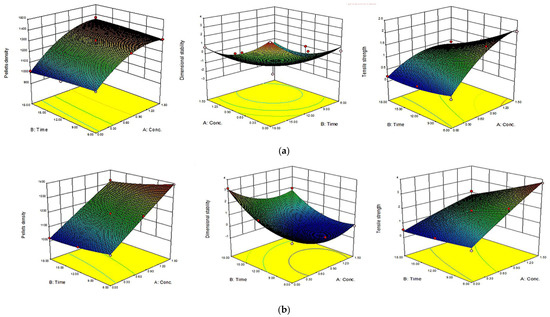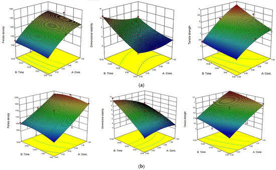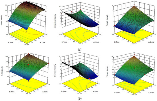 The 3D response surface and the 2D contour plots of the responses from microwave-assisted pre-treated canola straw and oat hull pellets are shown in Figure 4, Figure 5, Figure 6 and Figure 7. In order to depict the interactive effects, each of these responses’ pellet density, dimensional stability and tensile strength were kept constant while the two independent variables (alkali concentration and MW heating) varied within certain ranges. The response surfaces and contour plots of the samples differ according to the alkali solution used in the study. Comparatively notable interactions among the variables were shown in microwave/NaOH pre-treated samples by their shapes and contours compared to KOH pre-treated samples. The interaction among the pellet density, dimensional stability and tensile strength significantly influenced the pellet quality of the samples regardless of the alkaline concentration and microwave heating time of the samples.