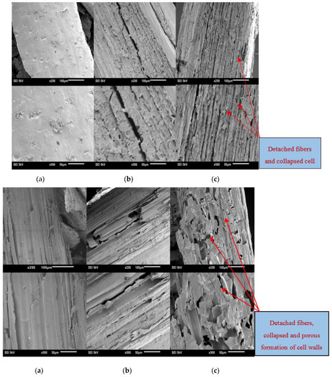 SEM images of oat hull (a–c) and canola straw (a–c) at 250 and 500× magnifications: (a) untreated sample; (b) microwave pre-treated with distilled water; (c) microwave-assisted alkali pre-treated.