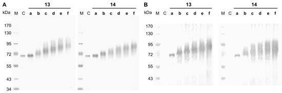 Neo-glycoproteins were purified by ultrafiltration to remove unbound glycans and analyzed by SDS-PAGE (Figure 1). Coupling of 11 or 12 to BSA led to theoretical increase of BSA protein mass by 1281.5 or 1322.5 g/mol per attached glycan, respectively. Shifts towards higher molecular weights are clearly visible in Figure 1A for neo-glycoproteins 13b–f and 14b–f accompanied by increased broadening of protein bands. The smearing character of the bands of glycosylated BSA resulted from irregular binding of detergents like SDS due to hydrophilic glycans [46] and probably a distribution of coupling degrees within the neo-glycoprotein fractions. Neo-glycoproteins 13b–f and 14b–f show a significant increase of molecular masses with increasing glycosylation densities. Neo-glycoproteins 13a and 14a were only modified to a minor degree. In addition, a streptavidin blot analysis proved the biotinylation of the neo-glycoproteins 13a–f and 14a–f, while unmodified BSA was not detectable (Figure 1B).