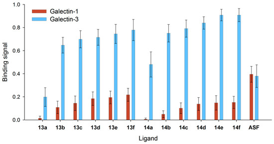 Comparison of Gal-1 and Gal-3 binding to immobilized neo-glycoproteins. In the ELISA-type assay, binding of 1 µM Gal-1 () and Gal-3 () to neo-glycoproteins 13a–f and 14a–f and to asialofetuin (ASF) as the control was measured. Signals showed different binding signals of both galectins to BSA decorated with C6-biotinylated tetrasaccharides.