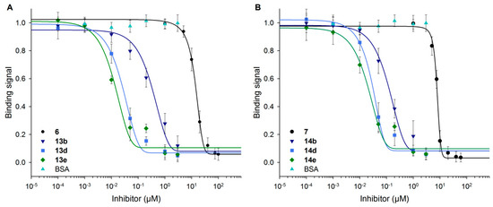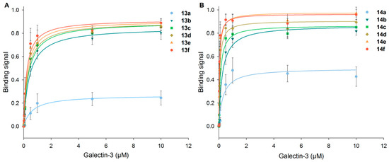 High-affinity glycan ligands for Gal-3 are of interest as inhibitors in biomedical applications [51,75,76]. In this context, we performed inhibition assays for Gal-3 binding to immobilized ASF using neo-glycoproteins of low (13b, 14b), medium (13d, 14d) and high modification degrees (13e, 14e).