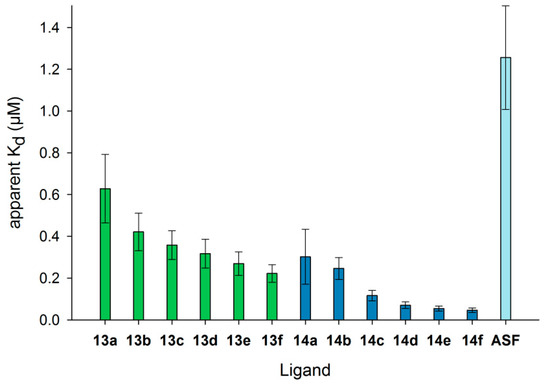 Apparent Kd values of Gal-3 for binding to immobilized neo-glycoproteins. The Gal-3 concentration (µM) at half-maximal binding (Kd) is shown for the different neo-glycoproteins 13a–f () and 14a–f (), as well as ASF (). Kd values decreased with increasing modification degree, indicating higher affinity of human Gal-3 (see Table S3 in the Supplementary Materials).