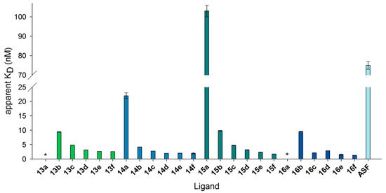 KD values resulting from binding of neo-glycoproteins on immobilized Gal-3 in SPR measurements. Gal-3 was immobilized on a sensor chip, and binding to neo-glycoproteins as well as ASF was monitored in flow (20 µL/min). Apparent KD values were calculated for one concentration by fitting association and dissociation using the software Scrubber2. The numbering of the ligands is explained in Table 3. (* KD was not detectable).