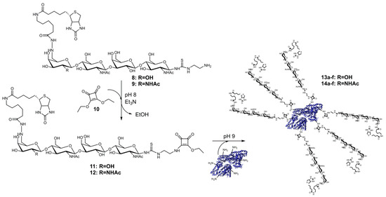 Recently, we successfully used squaric acid diethyl ester (10) as a bifunctional aminoreactive linker [43] for tunable conjugation of glycans to BSA [37]. In the same way, we synthesized here multivalent BSA-based neo-glycoproteins presenting biotinylated tetrasaccharides (Scheme 2). First, the tBoc-linker structures of 6 and 7 were deprotected as described previously [37] to obtain amino-linker functionalized products 8 and 9. MS-spectra of these compounds are shown in the Supplementary Materials (Figure S1C,D). Since compound 10 reacts also with secondary amines [44], which are present in the biotin moiety, reactions of 8 and 9 were optimized. It turned out that reaction at pH 8.0 and 4 °C for one hour was suitable to produce high amounts of 11 and 12 (Scheme 2). The products were separated from by-products by preparative HPLC, and yields of 42% (2.1 µmol) for 11 and 74% (2.4 µmol) for 12 were obtained. Starting from tetrasaccharides 1 and 2, overall yields of approximately 15% were obtained. LC-MS results (Figure S1E,F) confirmed the integrity and purity of compounds 11 and 12.
