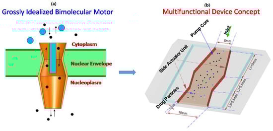 Nature’s nanomachines include molecular pumps, motors, and sorters. They are the essential agents of movement and are integral parts of many living organisms. Nature’s molecular structures such as NPC (nuclear pore complex) are multifunctional, and are far more efficient than any man-made sensors/actuators. The NPC senses, actuates, and controls the transport of all cellular material between the cytoplasm and the nucleus, and this process occurs in all biological cells of many organisms including yeast, vertebrate, and others. In the presence of appropriate chemical stimuli, the NPC opens or closes, like a gate, and permits and modulates the flow of material into and out of the nucleus proteins by biochemical interactions, ion potential, and hydrodynamic transport [,,,,,,,,,]. The actual dynamics of molecular transport across the NPC are not completely known. Due to the NPC’s complex architecture, the structural changes as well as property changes during transport are not completely understood. Even though the complete structure–function of this biological motor is not understood completely, our objective is to take inspiration from this biological motor and investigate a design concept for multifunctional applications.