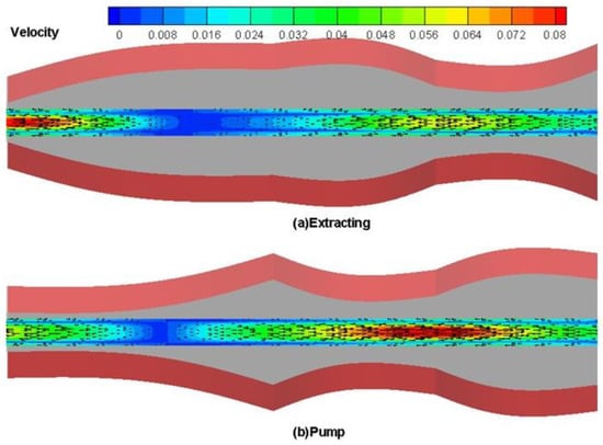 Fluid pumping through the device—instantaneous velocity vector contours at 50 Hz. (a) Extracting; (b) pumping.