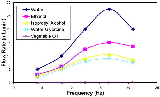 The results of flow rate obtained with varying actuator strokes (frequencies) for different fluids are summarized in Figure 5. As shown in Figure 5, the flow rate for various fluids follows a similar pattern when flow rate is increased. The flow rate increases, reaches an optimum, and then decreases. Out of the five fluids tested, water with high density had a higher flow rate in comparison to other fluids. Unfortunately, we did not test the device with any body fluids or simulated buffers. However, the authors feel that the range of fluids tested will give an idea of the feasibility of pumping different fluids through our device. However, the pumping rates for particular specific fluids may be different. Overall, the results of design simulations and limited testing illustrate the utility of the microdevice for drug transport/pumping applications.