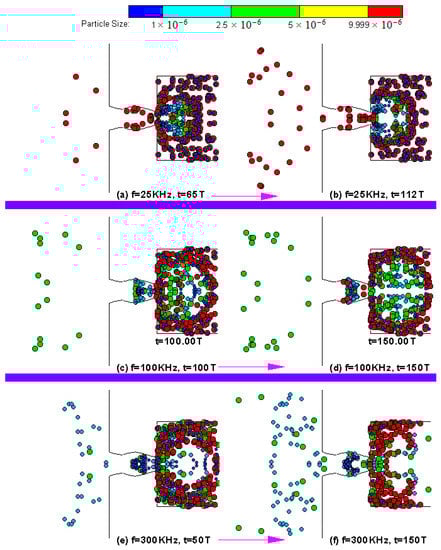Design simulations of a particle separator device. (a) f = 25 KHz, t = 65 T; (b) f = 25 KHz, t = 112 T; (c) f = 100 KHz, t = 100 T; (d) f = 100 KHz, t = 150 T; (e) f = 300 KHz, t = 50 T; (f) f = 300 KHz, t = 150 T. Reproduced from reference [], with the permission of ASME Publishing.