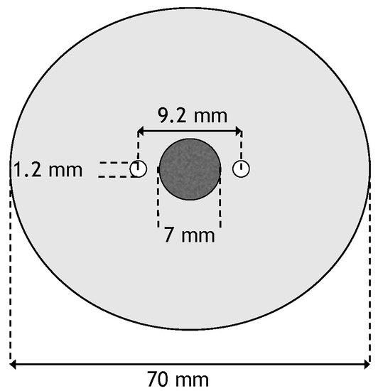 A two-dimensional geometry was used for the numerical model. It consisted of two monopolar electrodes whose centers are spaced 9.2 mm apart. In between the two electrodes is a circular tumor with diameter of 7 mm. The tumor is centered in a circular domain with a diameter of 7 cm. The electrodes have a diameter of 1.2 mm [26]. This results in a distance of 0.5 mm between the tumor and the electrodes. A schematic of the geometry can be seen in Figure 1.