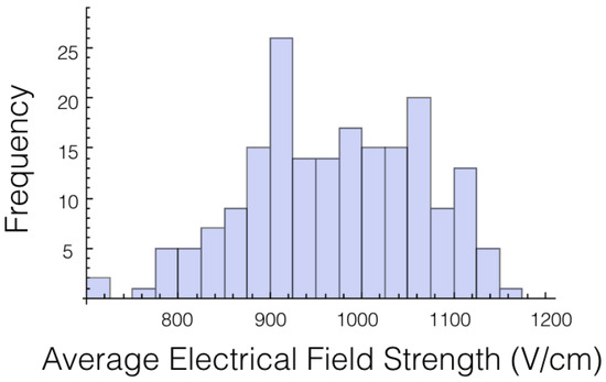 A histogram for the average electrical field experienced by the tumor for 1725 V is displayed in Figure 2. The histogram shows the shape is roughly symmetrical. Similar results were found for the other voltages and other cases.
