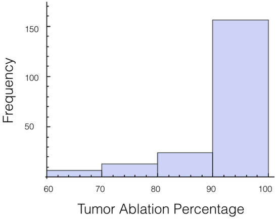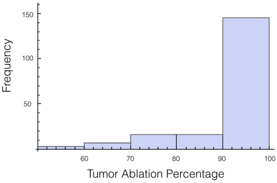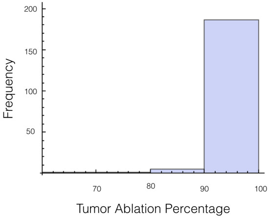 Again, the number of trials in which 10% or more of the tumor experienced an electrical field less than 700 V/cm was calculated. At 1725 V, it was 55 out of 200 or 27.7%, and for 2000 V it was 27 out of 200 or 13.5%. The histogram for the percentage of tumor above 700 V/cm can be found in Figure 5 for 1725 V and in Figure 6 for 2000 V.