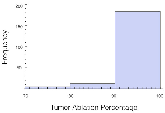 It was also investigated to get an estimate of how many trials exposed 90% of the tumor to an electrical field strength of 700 V/cm. This was done to get an idea of the chance of recurrence by not eliminating enough of the tumor. For 1725 V, 29 out of 200 or 14.5% of the trials exposed less than 90% of the tumor to the ablating electrical field strength. This number drops to 9 out of 200 or 4.5% when a voltage of 2000 V is applied. These numbers seem high for both the 1725 V case and 2000 V case when the goal is to ensure a high enough level of tumor ablation to prevent cancer recurrence and suggest using an even higher voltage for treatment. Histograms showing ablation percentage at 700 V/cm is displayed in Figure 3 and Figure 4.