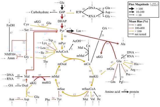 Chinese hamster ovary metabolic network model in Case Study I and III (adapted from [,]). The dashed arrows indicate the measured exchange (uptake) fluxes. The magnitudes of the flux estimates are indicated by the thickness of the arrows, while the colors of the arrows represent the average relative magnitude of the specification bias caused by the removal of the reaction.