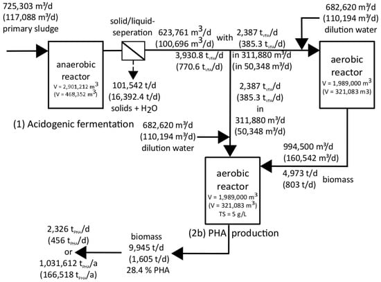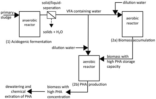 PHA production in WWTP takes place in two steps, which composes the production of volatile fatty acids (VFA) in an anaerobic process and finally the PHA production in an aerobic process (see also Figure 2). In contrast to [,] the PHA production process described in this work is designed as a side stream process of a municipal WWTP and does not include the treatment of waste water. Therefore, the whole process can focus on polymer production only.