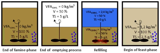 The emptying and refilling process at the beginning of every cycle is represented in Figure 3. In order to reach a VFA concentration of 1.2 and regarding to the fact that the VFA concentration at the end of a cycle is zero, a substrate with a VFA concentration of 2.4 is needed if half of the reactors volume is exchanged.