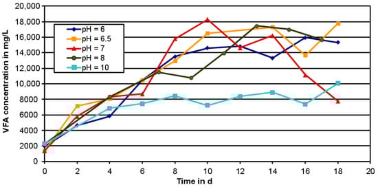 For the batch tests (pH, pre-RT) all reactors were filled with primary sludge at the beginning and samples of 100 mL were retrieved every day to determine the VFA concentration and composition. The batch test period was 18 days to 20 days long. Former studies show a high VFA production in a pH-range between 5 [] and 9 [] or 11 []. In consequence a range of pH-levels (pH = 6, 6.5, 7, 8, 10) were tested.
