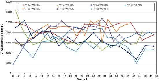 For a better comparability regarding the different RT and WD, the average of the VFA concentration during the test period was calculated. In a second step, the average VFA concentration was used to calculate the average VFA production rate (PRVFA). This step also eliminates the reactors size and can hence be considered as average VFA production rate per day and litre, which will be referred to production rate (PR) hereinafter (Equation (4)).
