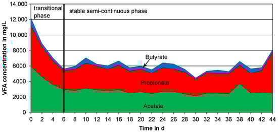 The degree of acidification (DA) was calculated according to [] as shown in Equation (2). As VFA results are given in mgVFA/L they have to be converted into COD units as shown in Equation (3)