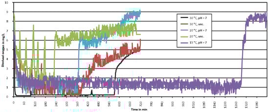 PHA production itself is based on a bacteria mixed culture selection from excess sludge via aerobic dynamic feeding. The installed feast/famine regime for enrichment of PHA producing bacteria is state of the art and tested by many authors [,,,]. The feast-phase is defined as a period of substrate availability and could be monitored via the reactors oxygen concentration. During the period of starvation (famine-phase) bacteria with the ability of polymer-storage gained a selection advantage as they are able to use the stored polymers as carbon and energy source.