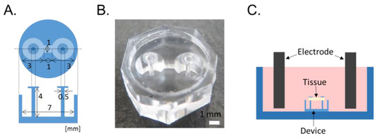 (A) Configuration of the microdevice, (B) Image of the fabricated device, (C) Schematic diagram of skeletal muscle tissue culture and electrical stimulation.