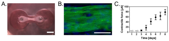 (A) Top view image of a skeletal muscle tissue constructed on the device. The scale bar reads 1 mm; (B) Fluorescence micrograph of a myotube in the skeletal muscle tissue on the device, which was cultured in DM for six days. Here, green indicates fast MHC and blue indicates the nuclei. The scale bar reads 50 µm; (C) Time course of contractile force after culturing in DM. Results represent mean ± SD (n = 3). N.D. indicates not detected.