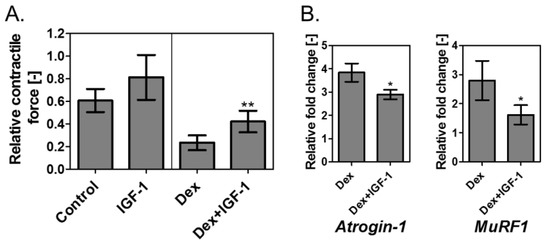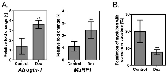 The addition of Dex to skeletal muscle cells cultured in 2D is known to increase the expression of atrogenes including ubiquitin ligases Atrogin-1 and muscle-specific RING-Finger protein, MuRF-1 [24]. The expression profile of these genes in the skeletal muscle tissues with reduced contractile force (treated with 100 μM Dex for 24–48 h) was examined. The obtained values were normalized using β-actin. Compared with the control, expression levels increased significantly by 2.6 times for Atrogin-1 and 2.2 times for MuRF-1 because of Dex addition (Figure 4A).