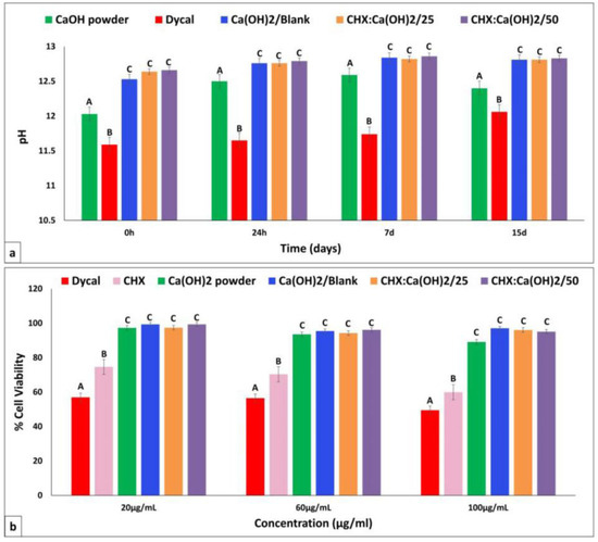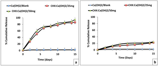 | Ca(OH)2/Blank | CHX:Ca(OH)2/25 mg | CHX:Ca(OH)2/50 mg | Commercial Ca(OH)2 Powder | Dycal | |||