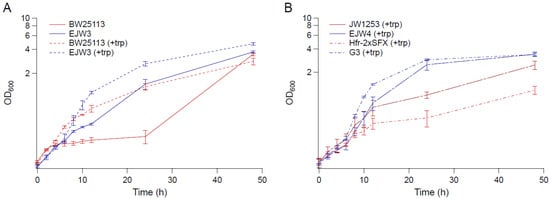 The growth kinetics of strain BW25113, EJW3 (BW25113 rpoC K370_A396dup), JW1253 (BW25113 ΔtrpB769::kan), EJW4 (BW25113 rpoC K370_A396dup, ΔtrpB769::kan), G3 (evolved osmotolerant mutant containing rpoC K370_A396dup mutation, BW25113 background), and Hfr-2×SFX- (ancestor of G3, BW25113 background) [24] were compared in M9 supplemented with 0.6 M NaCl and 50 µg mL−1 tryptophan (Figure 1). Since BW25113 and EJW3 are prototrophic for tryptophan, we also compared the growth of these two strains in the absence of tryptophan to assess the impact of the rpoC K370_A396dup mutation on osmotic tolerance in the absence of amino acid supplementation. The results showed that in the absence of tryptophan supplementation, the growth of BW25113 was drastically inhibited by 0.6 M NaCl 4 h after incubation with no significant growth observed within the next 20 h, while strain EJW3 continued to grow and reached significantly higher biomass than BW25113 after 24 h. The data showed that the addition of tryptophan significantly increased the growth of both BW25113 and the reconstructed rpoC mutant EJW3 in the presence of 0.6 M NaCl (Figure 1A). Though the addition of tryptophan improved the performance of all strains tested in the presence of 0.6 M NaCl, strains with the rpoC K370_A396dup mutation (EJW3, EJW4, and G3) still outperformed their rpoC wild-type counterparts (Figure 1A,B), strongly suggesting that the rpoC K370_A396dup mutation is a causative mutation for enhanced osmotic tolerance. Interestingly, the level of osmotic tolerance conferred by the rpoC mutation alone was on the same level as that conferred by the addition of 50 µg mL−1 tryptophan. Results in Figure 1 showed no significant difference in specific growth rates during the first few hours of growth between BW25113 and EJW3; therefore, biomass concentrations after 24 and 48 h were used to assess osmotic tolerance for the majority of this work.