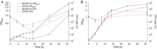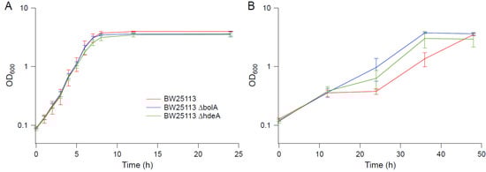Growth kinetics of knockout strains in BW25113 background. (A) M9. (B) M9 supplemented with 0.6 M NaCl. Error bars are standard deviations.