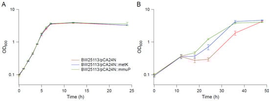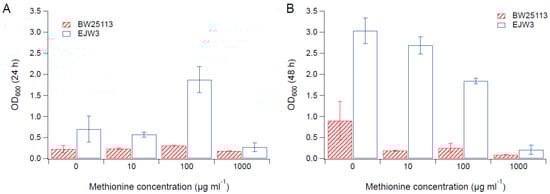Cell density in M9 supplemented with 0.65 M NaCl and methionine. (A) Cell density after 24 h. (B) Cell density after 48 h. Error bars are standard deviations.