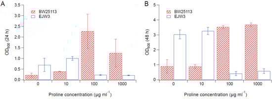 Cell density in M9 supplemented with 0.65 M NaCl and proline. (A) Cell density after 24 h. (B) Cell density after 48 h. Error bars are standard deviations.