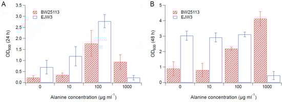 Cell density in M9 supplemented with 0.65 M NaCl and alanine. (A) Cell density after 24 h. (B) Cell density after 48 h. Error bars are standard deviations.