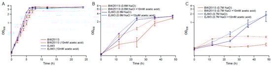 To determine the role acetic acid plays on osmotic tolerance, we compared the growth kinetics of BW25113 and EJW3 in the presence of 10 mM acetic acid in M9 with or without the supplementation of 0.6 M NaCl. In the absence of osmotic stress, the addition of 10 mM acetic acid showed no significant impact on the growth of either strain (Figure 6A). However, the addition of acetic acid significantly improved the growth of BW25113 but only had a moderate impact on the growth of EJW3 in the presence of NaCl challenge (Figure 6B). Under higher osmotic stress with 0.7 M NaCl, acetic acid addition still had a benefit on the growth of BW25113, and showed a moderate benefit on the growth of EJW3 (Figure 6C). Prior work has shown that moderate concentration of NaCl can protect E. coli from acetic acid toxicity [48]; here we show that the cross tolerance is reciprocal, that moderate concentrations of acetic acid can also protect E. coli from NaCl stress. Interestingly, a statistically significant overlap (p < 10−20, Fisher’s exact test) between metabolites level changes in organic acid and osmotolerant E. coli mutants has been detected using an updated version of the Resistome combined with a recent genome-wide survey of genotype–metabolite relationships [49,50], providing additional evidence that the improved osmotic tolerance of EJW3 may also result from the higher production of acetic acid.