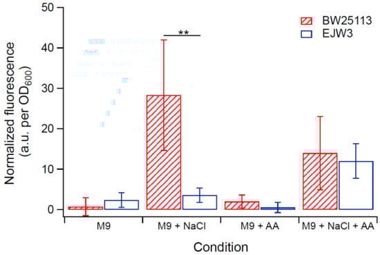 Cell membrane perturbation was analyzed by measuring the uptake of the fluorescent dye propidium iodide (PI). The OD600 of cells grown in M9 was adjusted to ~0.6, treated with M9 only, M9 supplemented with 0.7 M NaCl, M9 supplemented with 10 mM acetic acid, or M9 supplemented with 0.7 M NaCl and 10 mM acetic acid for 30 min at 37 °C. The treated cells were centrifuged at 21,130× g for 2 min, and pellets were re-suspended in PBS. PI staining was performed as previously described [29,30]. Briefly, PI was added to cells at a final concentration of 2.9 µM and incubated in the dark for 10 min at room temperature, then the cells were washed twice with PBS. To quantify uptake of PI, 200 µL of each sample was placed in black-walled 96-well plates (Greiner Bio-One, Monroe, NC, USA) and the fluorescence of PI staining was measured using a fluorescent plate reader (Molecular Devices SpectraMax® Gemini EM, Sunnyvale, CA, USA) using an excitation wavelength of 495 nm and an emission wavelength of 615 nm. The background fluorescence was corrected by subtracting the fluorescence of cells without PI straining. All fluorescence data were normalized by OD600. Three biological replicates were used in each condition.
