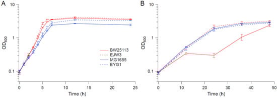 Growth kinetics of MG1655, EYG1, BW25113 and EJW3. (A) M9 (B) M9 supplemented with 0.6 M NaCl. Error bars are standard deviations.
